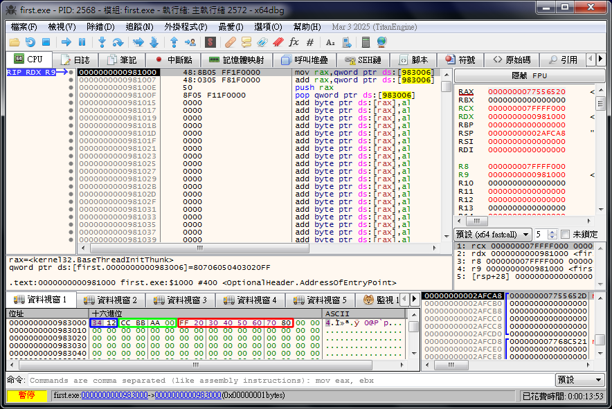 °²¦p¤w¦³¤F¦ì§}ªº·§©À¡A¨º»òÀ³¸Ó¬Ý¬Ý°O¾ÐÅ骺¦ì§}¡A¥H¤Î¨ä¤ºªº¸ê®Æ¨ì©³¬O«ç»òªºÃö«Y¡H¤U¹Ï¬O¥Î x64dbg ¸ü¤J FIRST.EXE ¤§«á©Ò§e²{ªºµøµ¡¡A¤p¤ì°¸©óµy«á®É¦A¥J²Ó»¡©ú¸ü¤J¹Lµ{¡A²¦³º¡A¦p¦ó¨Ï¥Î x64dbg ¬O°£¿ùªº¥²³Æ§Þ¡C¤£¹L¡A²{¦b¥u¶·ÁA¸Ñµ{¦¡½X¡B¸ê®Æ¦b°O¾ÐÅ餤ªº¼Ë¤l§Y¥i¡C
