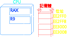 ·í CPU nŪ¨ú¡u[r9+10h]¡v°O¾ÐÅ餺ªº¸ê®Æ®É¡A¥²¶·¥ý¨ú¥X R9 ¼È¦s¾¹¤§¼ÆÈ¡A¦A¥[¤W 10h¡A¤~¯à±o¨ì¯u¥¿nŪ¨úªº¦ì§}¡A¦A¨ì¦¹¦ì§}¤WŪ¨ú¼ÆÈ¡C¨Ò¦p¥k¹Ï¤¤¡A°õ¦æ§¹³o¨â¹D«ü¥O«á¡ARAX ¬° 12345h¡C