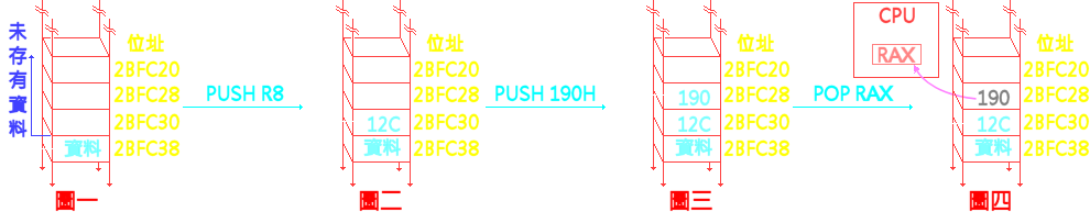 ¤U¹Ï¤¤¡A¨CÓ¬õ¦âªº¤è¶ô¬O¤K¦ì¤¸²Õªº°O¾ÐÅé¡C¥ý¬Ý¹Ï¤@¡A°²³] RSP ¬° 2BFC38h¡A¥ç§Y°ïÅ|³»ºÝ¦ì©ó¦¹¦ì§}¡C¦b 2BFC38h ³B¥H¤Î¸û°ª¦ì§}ªº°ïÅ|¡A§¡¤w¦s¦³¸ê®Æ¡A¦]¦¹»¡ RSP «ü¦V¦s¦³¸ê®Æªº³Ì§C¦ì§}¡C·í°õ¦æ¨ì¡uPUSH R8¡v®É¡A¥ý§â RSP ´î¤K¡A«ü¦V 2BFC30h ³B¡A¦A§â R8 ¤§È¡A12ch¡]µ¥©ó¤Q¶i¦ìªº 300¡^¦s¤J¦¹¦ì§}ªº°O¾ÐÅ餺¡C³o¼Ëªº¸Ü¡ARSP ¤´¬O«ü¦V¤w¦s¦³¸ê®Æªº³Ì§C¦ì§}¡A°ïÅ|³»ºÝ¦V§C¦ì§}©µ¦ù¤KӦ줸²Õ¡A¦p¤U¹Ï¤G¡C