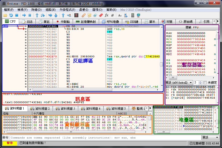 ¤W¹Ï¤¤¡A³Ì¤W¤èªº¼ÐÃDÄæ¦³¡ufirst.exe¡v¡A¥Nªí¤w¸ü¤Jµ{¦¡¤F¡Cx64dbg ªºµe±©M OllyDbg «Ü¹³¡A¤]¤À³Î¦¨´XÓ¥Dnªºµøµ¡¡G①¤Ï²ÕĶ°Ï¡]ÂÅ¦â®Ø¡^¡B②°T®§°Ï¡]¬õ¦â®Ø¡^¡B③¸ê®ÆÅã¥Ü°Ï¡]¾í¦â®Ø¡^¡B④¼È¦s¾¹°Ï¡]µµ¦â®Ø¡^¡B⑤°ïÅ|°Ï¡]ºñ¦â®Ø¡^¡C