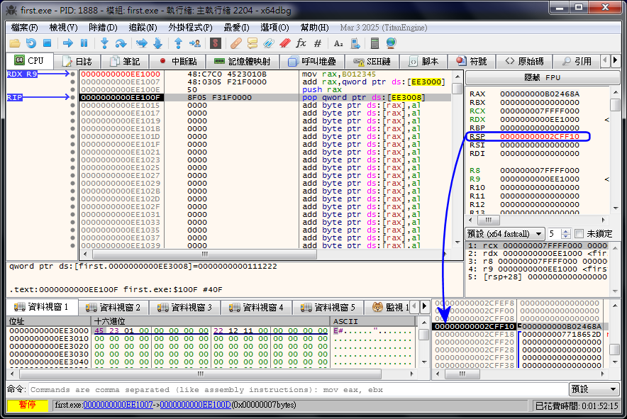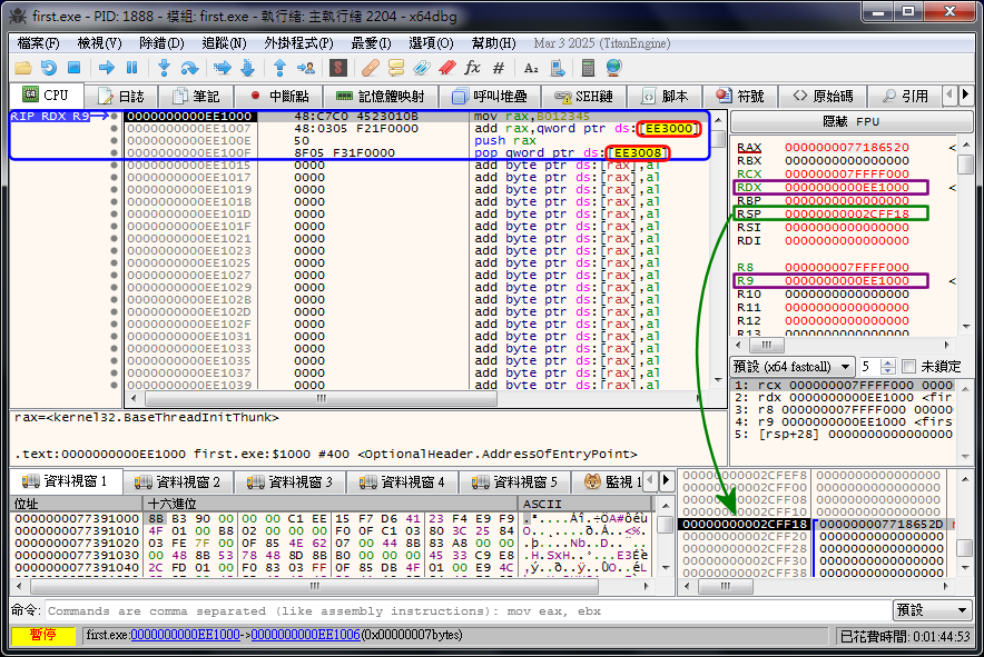 ¥i¥H¬Ý¨£ÂÅ¦â®Ø¤¤³Ì¥ªÃä RIP¡BRDX¡BR9 ³£«ü¦V¦ì§} EE1000h¡A³o¬O FIRST ªº¶i¤JÂI¡AÀËÅç¼È¦s¾¹°Ï¤¤³o¤TӼȦs¾¹¤§È¡A´N¬O EE1000h¡]µµ¦â®Ø¡A¦pn¬Ý¨£ RIP ¥i¥H©Ô°Ê¼È¦s¾¹°Ï¥kÃ䪺±²°Ê¶b¡^¡C¥J²ÓÆ[¹î¡A¥i¥Hµo²{ EE1000h ³oÓ¦ì§}I´º¬O¶Â¦âªº¡A³o¬O RIP «ü¨ì³oÓ¦ì§}©Ò¾ÉPªº¡CRIP ^¤å¬O instruction pointer register¡AºÙ¬°«ü¥O«ü¼Ð¼È¦s¾¹¡A¥¦©Ò«üªº¦ì§}¬O CPU §Y±N°õ¦æªº«ü¥O¤§¦ì§}¡A¦ý©|¥¼°õ¦æ¡C