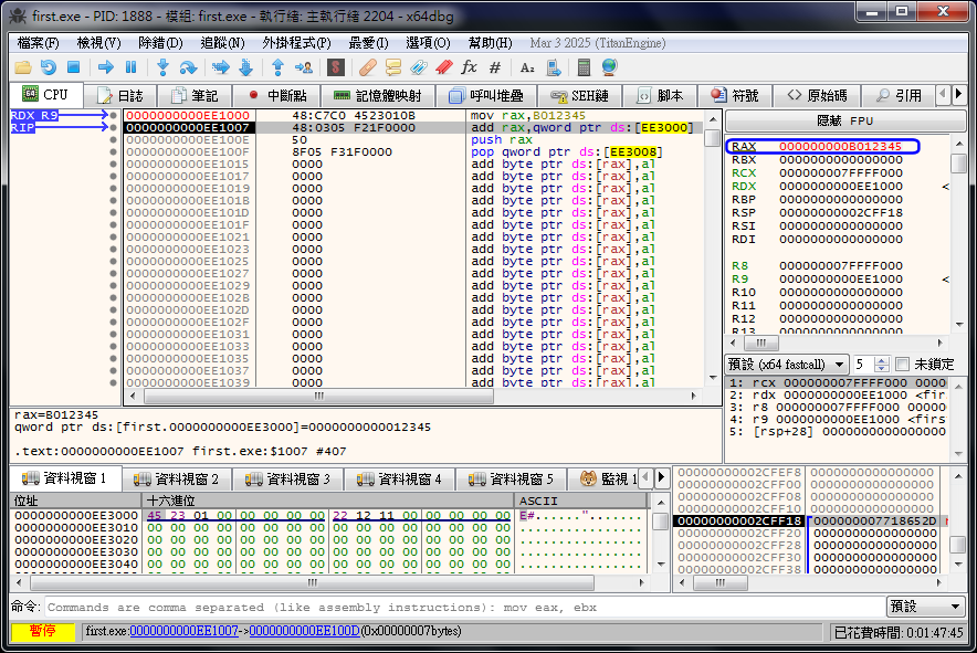 èè°õ¦æªº«ü¥O¬O¡uMOV RAX,0B012345h¡v¡A©Ò¥H¥i¥H¬Ý¨ì RAX ¤w¸gÅܬ°¦¹¥ß§YȤF¡A¥B¥H¬õ¦âªí¥Ü¡]¤W¹ÏÂÅ¦â®Ø¡^¡C»P¦¹´X¥G¦P®É¶¡¡ARIP «ü¦V¤U¤@¹D«ü¥Oªº¦ì§}¡A¤]¥i¥H§â¼È¦s¾¹°Ïªº±²°Ê¶b©¹¤U©Ô¡AÀˬd¬Ý¬Ý RIP ¬O§_¬° EE1007¡C