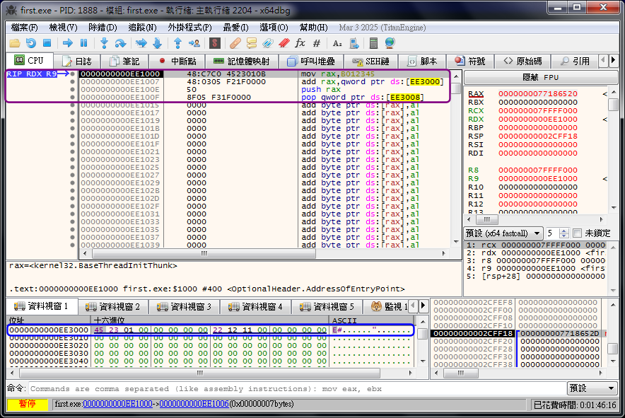 ¦³¨âÓ¤èªk¥i¥H¨Ï x64dbg Åã¥Ü FIRST ªº¸ê®Æ°Ï¬q¡G①¥H·Æ¹«¥ªÁäÂIÀ»¸ê®ÆÅã¥Ü°Ï¡÷«ö¤U Ctrl Á䤣©ñ¦A«ö¤U¡uG¡vÁä¡]¥ç§Y«ö¤U Ctrl¡ÐG¡^¡÷©ó¼u¥Xªº¹ï¸Ü²°¤¤¿é¤J¡uEE3000¡v¡÷«ö¡u½T»{¡v¡C②¥H·Æ¹«¥ªÁäÂIÀ»¸ê®ÆÅã¥Ü°Ï¡÷¦A«ö·Æ¹«¥kÁä¡÷¿ï¡u«e©¹¡]G¡^¡v¡÷¿ï¡uªíz¦¡¡]E¡^¡v¡÷©ó¼u¥Xªº¹ï¸Ü²°¤¤¿é¤J¡uEE3000¡v¡÷«ö¡u½T»{¡v¡C¤£ºÞþºØ¤èªk¡A³£·|±o¨ì¤U±µe±¡C³o®ÉԤϲÕĶ°Ï¬O FIRST ªºµ{¦¡½X¡A¸ê®ÆÅã¥Ü°Ï¤º¬O FIRST ªº¸ê®Æ°Ï¬q¡A°ïÅ|°Ï¬q¤ºªº°ïÅ|¸ê®Æ·|¥Ñ x64dbg ¦Û°ÊÅã¥Ü¡C