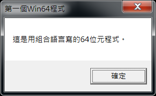 ³o¤@³¹¨Ó¼¶¼g¤@ÓÀ³¥Îµ{¦¡¡AFIRST_WND1.ASM¡A°õ¦æ®É¦b¿Ã¹õ¤WÅã¥Ü¤@Óµøµ¡¡A¦p¥k¹Ï¡A¼ÐÃDÄæ¬O¡u²Ä¤@ÓWin64µ{¦¡¡v¡Aµøµ¡¤¤ÁÙ¦³¤@Ó¡u³o¬O¥Î²Õ¦X»y¨¥¼gªº64¦ì¤¸µ{¦¡¡C¡v¦r¦ê¤Î¡u½T©w¡v«ö¶s¡A¨Ï¥ÎªÌ¥i¥H«ö¡u½T©w¡v«ö¶sµ²§ôµ{¦¡¡C