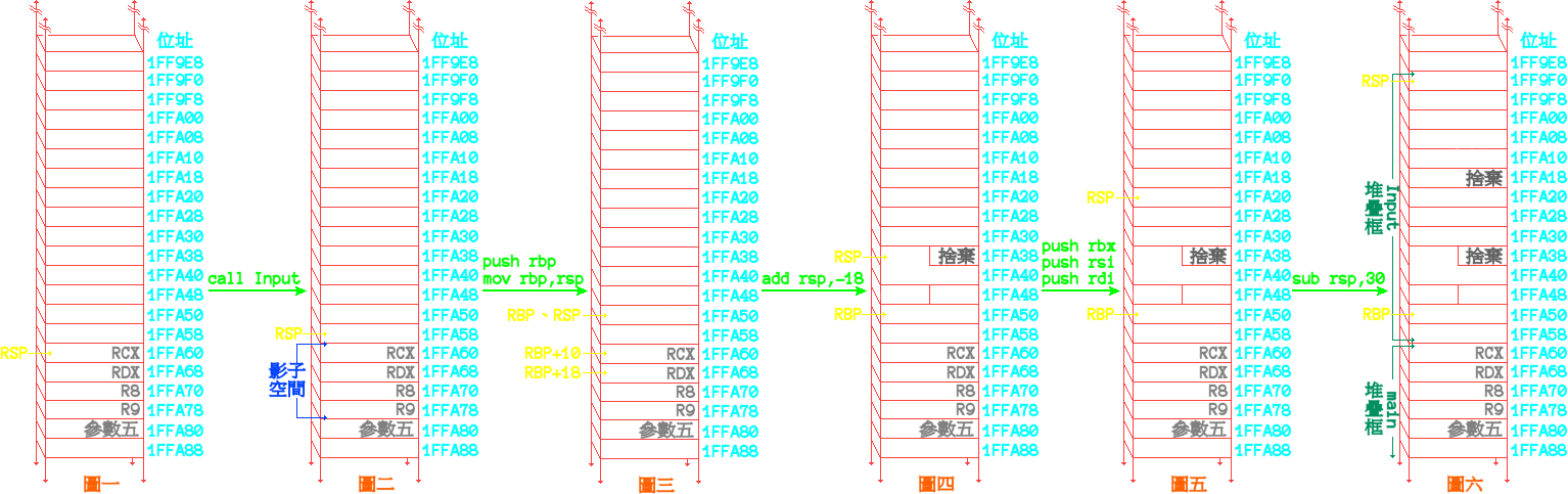 °õ¦æ¡uCALL Input¡v«á¡A±Nªð¦^¦ì§}±À¤J°ïÅ|¡A¨£¹Ï¤G¡C±µ¤U¨Ó´N¬O²Õ;¹²K¥[ªº¡upush rbp¡v¡B¡umov rbp,rsp¡v¨â¹D«ü¥O¡A°õ¦æ§¹«á°ïÅ|±¡§Î¦p¹Ï¤T¡C³o®ÉÔì¨Óªº RBP ¤w«O¦s¦b°ïÅ|¦ì§} 1FFA50 ³B¡A¦Ó¥B RBP¡BRSP ¤§È³£¬O 1FFA50¡C¦b Input ¤§¤º¦pn¦s¨ú°Ï°ìÅܼƩΰѼơA³£¥H 1FFA50 ¬°°ò·Ç¡F°£¦¹¤§¥~¡A¦b Input ¤º¡ARBP ¤§È³£¤£À³§ïÅÜ¡A³o¼Ë°µªº²z¥Ñ¦³¤G¡G①¦pªG§ïÅܦs¨ú°Ï°ìÅܼƩΰѼƴN·|¦³°ÝÃD¡C②±N¨Ónªð¦^ main ®É¡A¤£½× RSP §ïÅܦh¤Ö¡A¥un°õ¦æ¡umov rsp,rbp¡v´N¯à§ä¨ì¶i¤J Input ®Éªº°ïÅ|³»ºÝ¡A°õ¦æ¡upop rbp¡v´N¯à«ì´_ì RBP¡F©ÎªÌª½±µ°õ¦æ¡uleave¡v´N¯à¦P®É¹F¦¨¨â¹D«ü¥Oªº¥\¯à¡C
