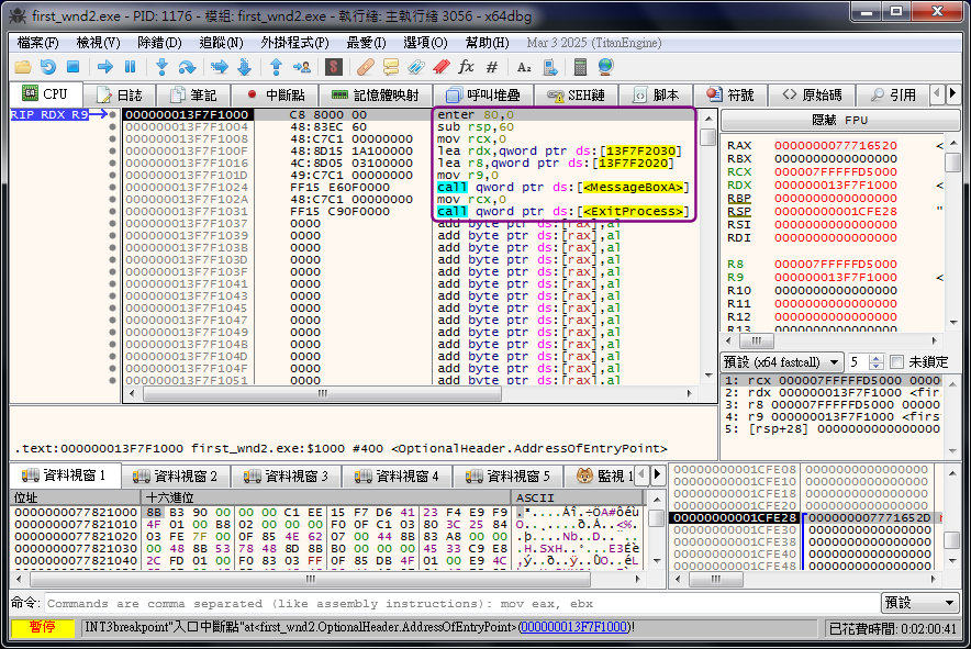èè´£¹L invoke ¦³´XÓ§@¥Î¡G·|¦Û°Ê½Õ¾ã¼v¤lªÅ¶¡¡A¨Ã¹ï»ô¸`¦ì§}¡A¯à¦Û°Ê±N«e¥|ӰѼƦs¤J¹ïÀ³ªº¼È¦s¾¹¤¤¡A²Ä¤Ó¤Î¨ä¥H«áªº°Ñ¼Æ±À¤J°ïÅ|¤¤¡AµM«á°õ¦æ CALL «ü¥O¡C©³¤U¥Î x64dbg ¸ü¤J FIRST_WND2.EXE Æ[¹î¬Ý¬Ý¡G